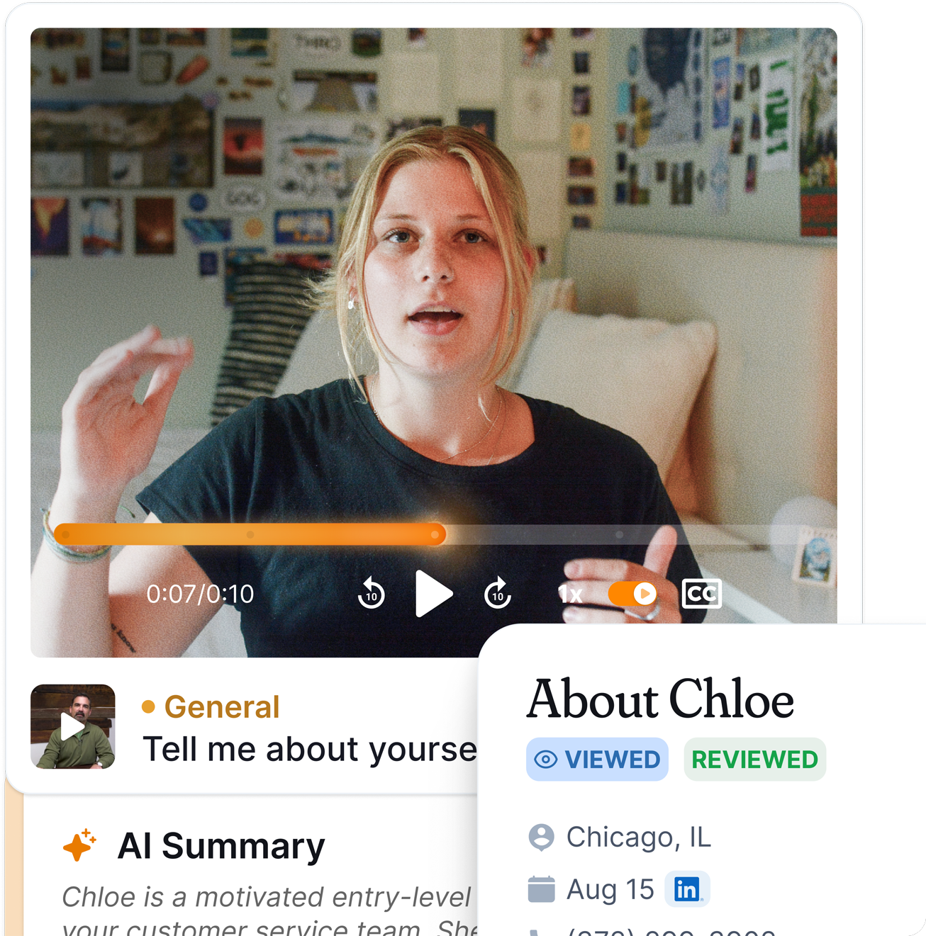 Candidates introduce themselves through short videos on their own time. You review on yours. See who people truly are, without the scheduling headache.